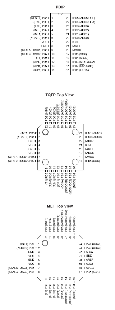 | ADC 7..6 (nur bei TQFP und MLF Gehäuse) | In den Bausteinen im TQFP und MLF Gehäuse stehen zwei weitere Anschlüsse zur Verfügung. ADC7 und ADC6 arbeiten als weitere Eingänge für den Analog-Digitalwandler. Sie arbeiten ebenfalls mit der analogen Versorgungsspannung und mit 10 Bit Auflösung. |