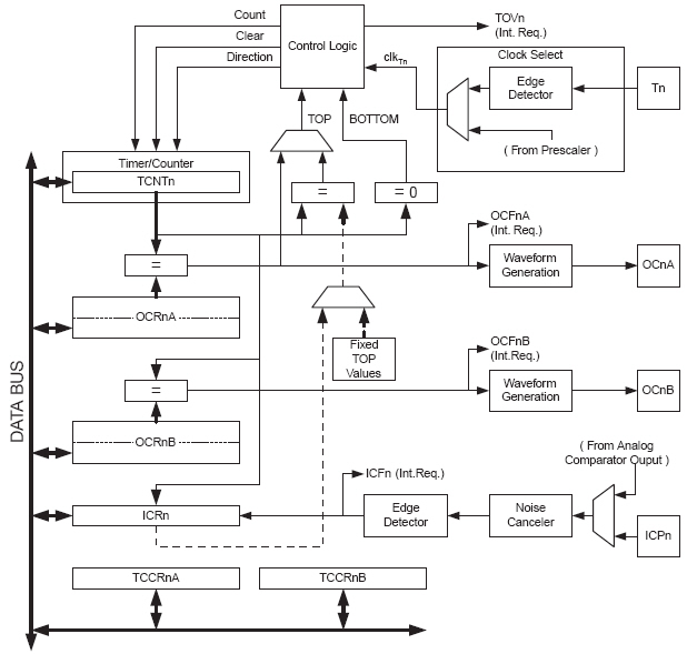 Ein einfaches Blockschaltbild des 16-bit Timer/Counter ist nachfolgend dargestellt. Die Nummern der Pins sind von der Gehäuseform des Bausteins abhängig (siehe Anschlussbelegung). Die I/O-Register, die dazugehörigen I/O-Bits und die I/O-Pins, auf die die CPU direkt zugreifen kann, sind fett dargestellt.
