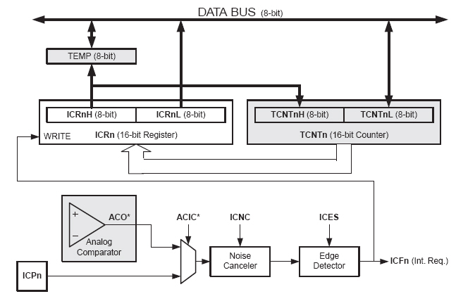 In nachfolgendem Abbild ist die Input Capture Einheit dargestellt. Die Elemente, die nicht unmittelbar zur Input Capture Einheit gehören sind grau schattiert. Das „n“ in den Registern und Bitnamen steht für die Nummer des Timer/Counters.
