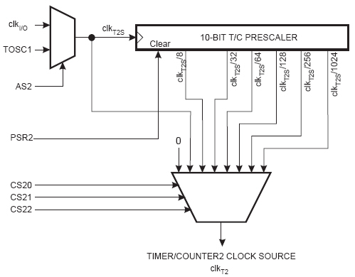Für Timer/Counter2 sind folgende Auswahlmöglichkeiten für den Vorteiler vorhanden: clkT2S/8, clkT2S/32, clkT2S/64, clkT2S/128, clkT2S/256, clkT2S/1024. Zusätzlich kann clkT2S als 0 (Stopp) ausgewählt werden. Das Setzen des PSR2 Bits im SFIOR Regsiter resetet den Vorteiler. Dadurch kann mit einem vorhersehbaren Vorteiler gearbeitet werden.