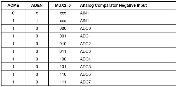 Es ist möglich jeden der ADC7 bis ADC0 Pins als negativen Eingang für den Analog Comparator zu verwenden. Für die Auswahl wird der ADC Multiplexer verwendet, so dass der ADC konsequenter Weise ausgeschaltet sein muss, um diese Möglichkeit zu nutzen. Wenn das Analog Comparator Multiplexer Enable Bit (ACME im SFIOR Register) gesetzt ist und der ADC ausgeschaltet ist (ADEN in ADCSRA ist Null), wählen die MUX2 bis MUX0 Bits im ADMUX Register den Pin aus, der als negativer Eingang für den Analog Comparator verwendet wird. Wenn das ACME gelöscht ist oder das ADEN gesetzt ist, wird immer der AIN1 Pin als negativer Eingang für den ACO verwendet.
