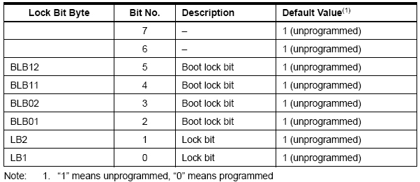 Der ATmega8 hat sechs Lock Bits, die unprogrammiert, also 1, bleiben können oder mit einer 0 programmiert werden können, um die gewünschten zusätzlichen Funktionen zu nutzen. Die Lock Bits können nur mit dem Chip-Lösch-Befehl gelöscht werden.