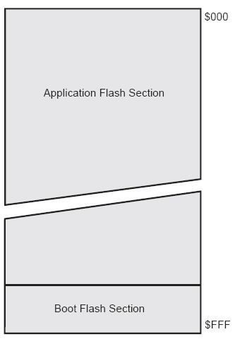 Der ATmega8 enthält 8k-Byte Programmspeicher, der als Flash ausgeführt ist und im System programmiert werden kann. Da alle AVR-Befehle 16 oder 32 Bit lang sind, ist der Programmspeicher in 4096 (4k) Speicherzellen mit je 16 Bit organisiert. Aus Gründen der Softwaresicherheit ist der Programmspeicher in zwei Sektoren unterteilt, den Boot-Sektor und den Applikations-Sektor.