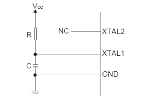 Bei zeitunkritischen Applikationen kann ein externer RC-Oszillator wie in nachfolgender Abbildung angeschlossen werden. Die Frequenz ergibt sich näherungsweise aus der Formel f=1/(3RC), wobei C mindestens 22pF groß sein sollte. Durch programmieren der CKOPT- Fuse kann eine interne Kapazität von 36pF zwischen XTAL1 und GND geschaltet werden, so dass der externe Kondensator entfallen kann.