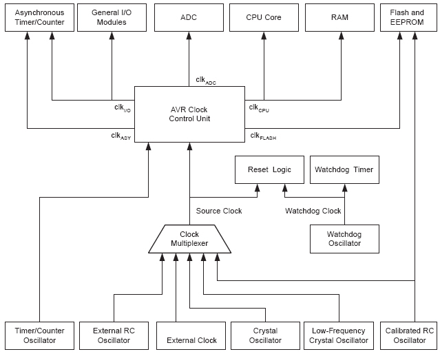 Der Takt für den Analog-Digitalwandler wird unabhängig von den anderen Takten erzeugt. Dadurch ist es möglich, den CPU- und I/O-Takt anzuhalten, während eine AD-Wandlung durchgeführt wird. Somit werden Störungen durch die digitalen Schaltkreise vermieden, die das Wandlungsergebnis beeinflussen können.