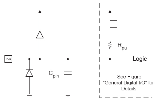 Alle AVR-Ports bieten eine echte lesen – verändern – schreiben Funktion, wenn sie als allgemeine digitale I/O-Ports verwendet werden. Das bedeutet, dass die Richtung eines einzelnen Port-Pins verändert werden kann, ohne dass die Richtung der anderen Pins beeinflusst wird, wenn man die SBI und CBI Befehle verwendet. Das gleiche gilt für das Ändern der Ausgangszustände einzelner Pins (wenn diese als Output konfiguriert sind) oder für das Ein- und Ausschalten der pull-up Widerstände, wenn die Pins als Eingänge fungieren. Jeder Pin hat einen symmetrischen Treiber, der sowohl positive als auch negative Ströme liefert, so dass an jeden Pin eine LED direkt angeschlossen werden kann. Alle Pins haben einen einzeln an- und abschaltbaren pull-up Widerstand dessen Größe unabhängig von der Versorgungsspannung ist. Ferner haben alle Port-Pins zwei Schutzdioden die gegen VCC und Masse geschaltet sind.