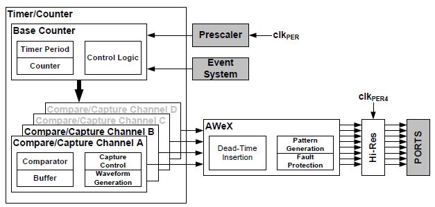Einige Timer/Counter haben Erweiterungen, um speziellere Wellenformen (AWeX: advanced waveform extension) und Frequenzen (hi-res: high resolution extension) zu erzeugen.
