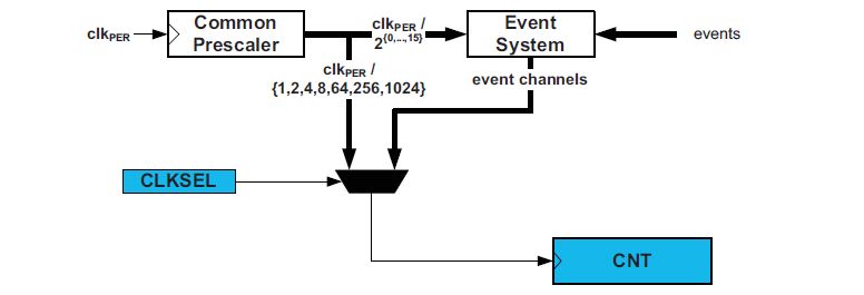 Der periphere Takt clk_PER wird in einen Vorteiler geführt. Die Ausgänge des Vorteilers können als Taktquelle ausgewählt werden. Zusätzlich kann die ganze Bandbreite des Vorteilens der Taktquelle über das Eventsystem genutzt werden.
