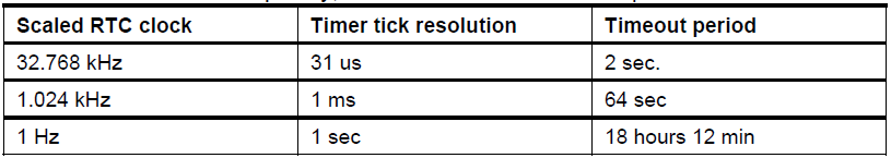 Der RTC beinhaltet einen 10 Bit Vorteiler mit dem der Takt heruntergeteilt werden kann bevor er auf den Zähler geführt wird. Somit kann eine große Spanne von Auflösungen oder Perioden erreicht werden.