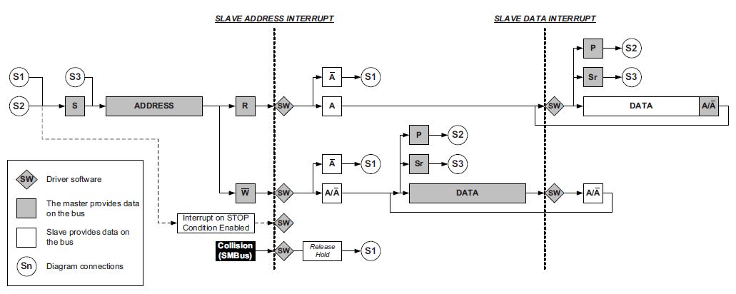 Wenn ein Interruptflag gesetzt ist, wird die SCL Leitung auf Low gehalten. Das gibt dem Slave Zeit, Daten zu verarbeiten und erfordert in der Regel das Eingreifen der Software.