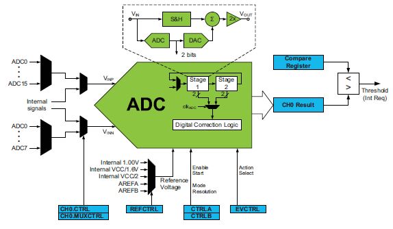 Der Analog Digital Converter (ADC) wandelt analoge Signale in digitale Werte um. Der ADC hat eine Auflösung von 12 Bit und ist in der Lage, bis zu 300.000 Messungen/Wandlungen/Proben (samples) pro Sekunde vorzunehmen. Die Auswahl der Eingänge ist flexibel und es sind sowohl einfache Messungen (single-ended) als auch Differenzmessungen möglich. Bei Differenzmessungen kann eine Verstärkerstufe zugeschaltet werden, um die dynamische Reichweite zu erhöhen (also sehr kleinen Differenzen zu verstärken). Zusätzlich sind verschiedene interne Quellen nutzbar. Der ADC kann Ergebnisse mit und ohne Vorzeichen darstellen.