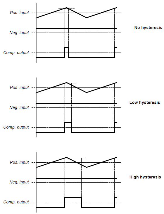 Per Software kann zwischen keiner, geringer und großer Hysterese ausgewählt werden. Die Verwendung der Hysterese kann einen ständigen Wechsel des Ausgangs vermeiden, wenn die Pegel beider Eingangssignale sehr nah aneinander liegen.