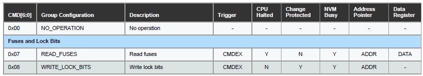 Bei der Selbstprogrammierung der Fuses und Lockbits werden die action-getriggerten Kommandos durch das Setzen des CMDEX Bits im NVM CTRLA Register gestartet. Die read-getriggerten Kommandos werden durch das Ausführen eines (E)LPM Befehls gestartet. Die write-getriggerten Kommandos werden durch den SPM Befehl gestartet. Einige der Kommandos sind durch das CCP geschützt.