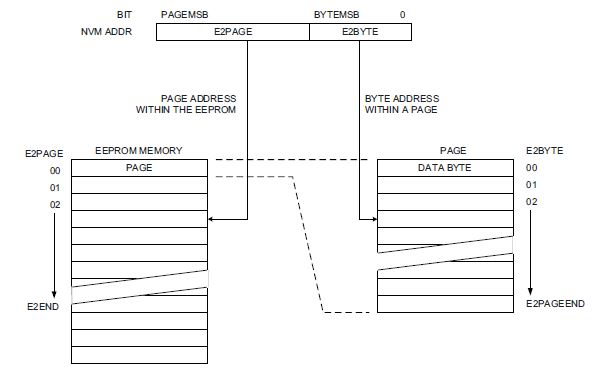 Beim Zugriff über den NVM Controller steht die Adresse im NVM ADDR Register und das Datenbyte im NVM DATA Register. Bei der seitenweisen Programmierung kann die Adresse als zweigeteilt betrachtet werden. Die oberen Bits adressieren die Seite und die unteren Bits die Bytes innerhalb einer Seite.