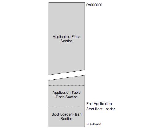 Boot loader Software muss im boot loader Abschnitt stehen, da nur hier der SPM Befehl ausgeführt wird. Der SPM-Befehl kann allerdings auf den ganzen Flash, also den application Abschnitt und den boot loader Abschnitt selbst zugreifen. Der boot loader Abschnitt kann auch für das allgemeine Programm (application) verwendet werden.