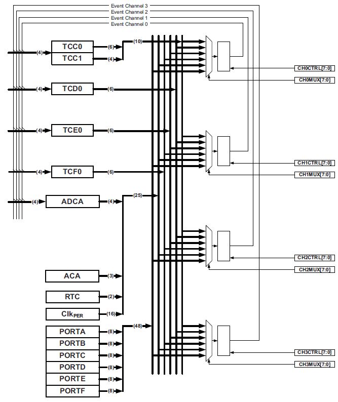 Das event routing Netzwerk besteht aus vier Multiplexern, die per Software konfiguriert werden. Sie werden als Event Channels bezeichnet und ermöglichen vier parallele Konfigurationen und routings. Die maximale routing Verzögerung beträgt zwei Taktzyklen der Peripherie.