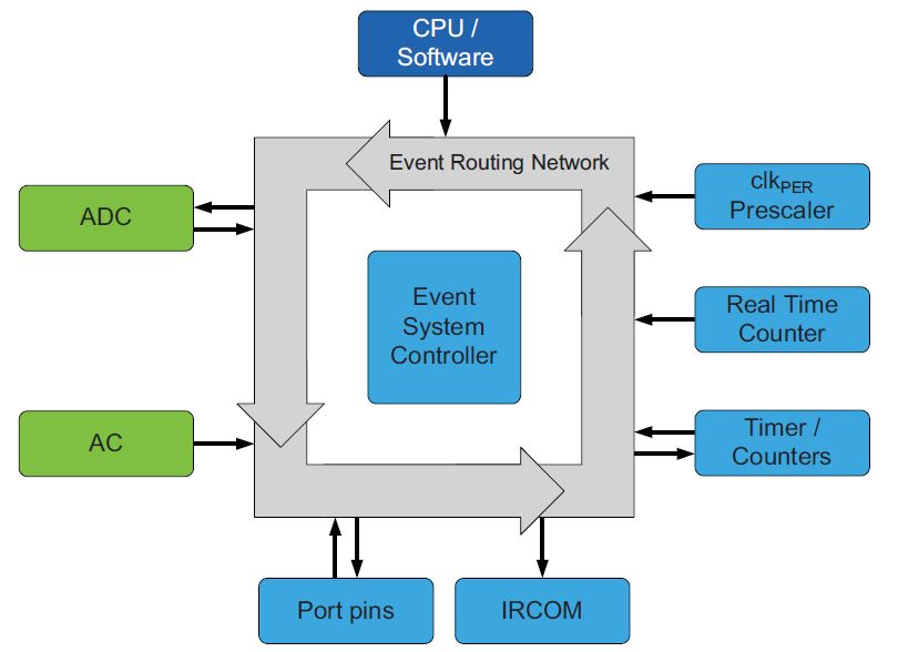Das Eventsystem ermöglicht die direkte Kommunikation und Signalisierung zwischen peripheren Modulen des Controllers. Dadurch ist es möglich, dass eine Statusänderung in einem peripheren Modul eine Aktion in einem anderen peripheren Modul auslöst. Das Event System ist so gestaltet, dass ein vorhersehbares System mit kurzen und vorausbestimmten Reaktionszeiten zwischen peripheren Modulen aufgebaut werden kann. Dabei müssen keine Interruptroutinen durch die CPU ausgeführt werden.