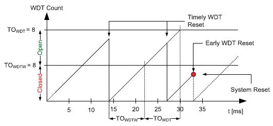 Im Window Modus verwendet der WDT zwei verschiedene timeout Perioden, eine mit „geschlossenem“ Fenster (TOwdtw) und eine mit „offenem“(TOwdt) Fenster. Während der Zeit, in der das Fenster geschlossen ist, kann der WDT nicht zurückgesetzt werden, wird in dieser Zeit trotzdem ein WDR-Befehl ausgeführt, wird der Controller resetet. Damit kann sichergestellt werden, dass das Programm nicht in einer Schleife gefangen ist, die den WDT dauerhaft (zu früh) zurücksetzt. Die Zeit des geschlossenen Fensters kann ebenfalls zwischen 8ms und 8s eingestellt werden. Die Gesamtzeit, die der WDT benötigt, um durch einen Überlauf einen Reset auszulösen ist die Summe aus beiden Timout-Zeiten. Der defaultwert für beide Zeiten wird mit fuses eingestellt.
