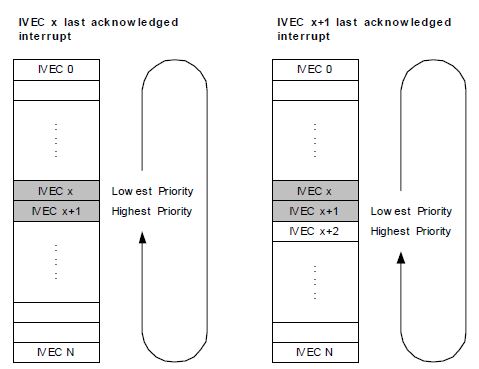Im Low-Level (nur in dem) können die Interrupts in einem round-robin Verfahren abgearbeitet werden. Damit wird sichergestellt, dass auch eine Interruptanforderung niedrigster Priorität abgearbeitet wird. Dies funktioniert, indem dem jeweils als letztes ausgeführen Interrupt anschließend die niedrigste Priorität zugeteilt wird. Er kommt also erst wieder an die Reihe, wenn alle anderen wartenden Interrupts abgearbeitet sind.