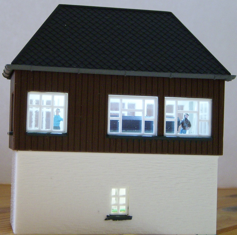 Der Innenraum des Stellwerks ist aber noch komplett leer. Das sieht hinterher auf der Modellbahnanlage nicht besonders gut aus, erst recht nicht, wenn die Beleuchtung eingeschaltet ist. Aus ein paar kleinen Leisten baue ich noch ein "Stellpult". Zusätzlich kommen zwei Mann als "Stellwerk-Besatzung" in den oberen Raum.